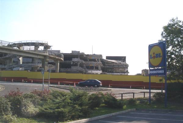 This photograph shows the partial demolition of the multi storey car park on the corner of Caradoc road and Llewellyn road. Opposite Lidl store.