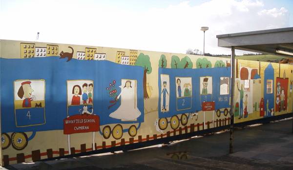 This photograph shows part of a 100metre long mural, surrounding construction work at General Rees Square. The `brightly coloured and lively mural` was planned and painted in the summer by school children from six local schools.