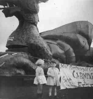This photograph, from my youth (circa 1958), shows the splendid and magnificent Welsh Dragon ( I remember it was vivid red), created by the hard work and dedication of the helpers from the Community Hall. The dragon was the centre piece on the `float` (flat bed lorry) ,that was West Pontnewydd`s `entry` in the yearly Cwmbran Carnival.