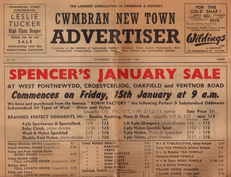 A SPENCER'S advertisement appeared in the CWMBRAN NEW TOWN ADVERTISER January 14th 1960