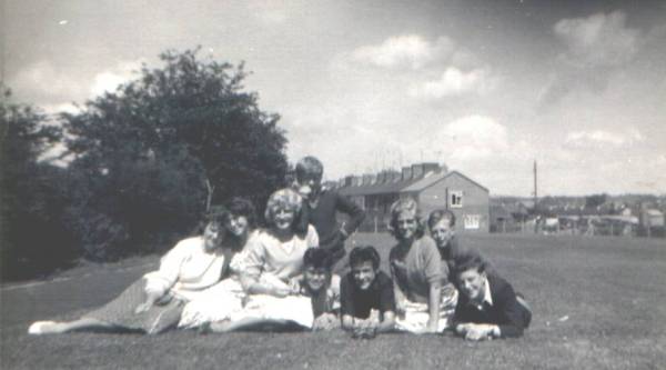 From left to right the first three young ladies are:- ?, ? , Coral Gibbs (nee Bodenam, Alistair's cousin), the lad leaning on the third girl's shoulder is Byron Lewis, next in line is Terry Bird; next is ? and next to him is Jenny Smith, followed by `tweeny` Harris, Allistair Howard.
