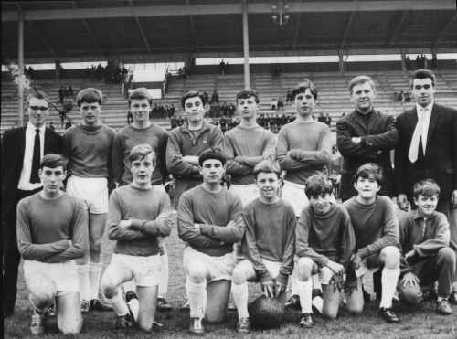 Back Row L to R:- Mr. Barry Roberts (Manager). Peter Livesey. Martin Gibbons. Mr. John Desmond. (Assistant Manager). Gerald Salter. Wayne Young. Dennis Hurley. Mr. Brian Williams. Bernard Stanley.