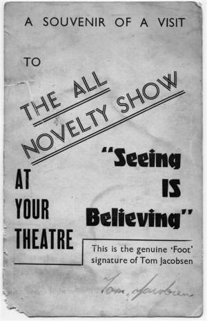 It appears Tommy was quite a renowned character,in his time who topped the `bill` at various Variety Halls and Theatres around the country; At Thurso's Riverside; Tommy 'Toes' Jacobsen, the `Fabulous Armless Wonder`, thrilled his audience with his `unusual` piano playing, firing a rifle, threading a needle and even shaving a member of the audience with his toes. It was said the place was `packed out`!