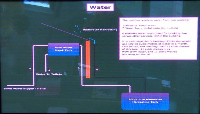 .. Harvested water is not used for drinking but serves other services within the building .. It is estimated that a building of this size would use 102.08 cubic metres of water in a month During September 2006, this building used 22 cubic metres of this total, 11 cubic metres was from `Town` water and 11 cubic metres has been harvested.. |